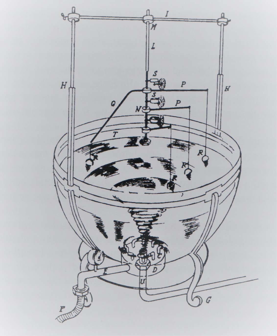 Poliedrico studioso anche costui, egli dimostrò attraverso alcuni esperimenti scientifici come tutti i fenomeni fisici hanno luogo e sono collegati fra loro, dando come presupposto l’esistenza di un “oceano d’etere” dove la materia si genera ed è immersa, e questa sostanza da luogo a leggi e meccanismi che trovano strette analogie con gli effetti dati da particelle o corpi immersi in una sostanza liquida, in altre parole la materia nell’universo, risponde a leggi simili a quelle della fluidodinamica. Cruciale fu l’esperimento dell’ “Idroplanetario” e del “Genegravimetro”. Potete rendervi conto voi stessi di che si tratta osservando la Fig. 1: un poderoso movimento di rotazione al centro della vasca genera un vortice in grado di trascinare tutte le altre masse poste a distanze diverse, e queste per controbilanciare il movimento roteano anch’esse dando luogo ad una rotazione su se stesse ed ad una rivoluzione attorno al centro del gorgo.
