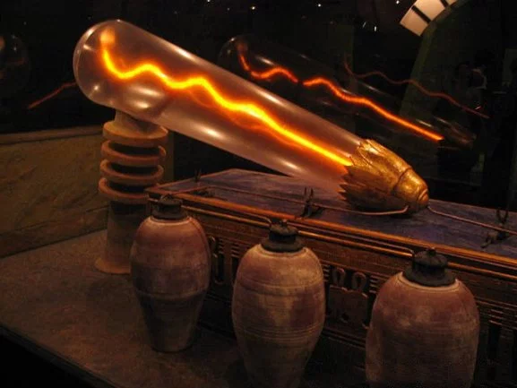 Difficile allora non pensare al geroglifico come alla raffigurazione di due lampade, e allo zed come ad un isolatore o un condensatore, dove la rappresentazione a “listelle” potrebbe essere voluta proprio per identificare gli strati di conduttori e isolanti sovrapposti, o alla sezione di una pila voltaica. Da notare che una struttura detta sempre “zed” è situata sopra la camera del re nella Grande Piramide, si può vedere bene nella vista in sezione(Fig. 3). D’altronde risulterebbe scontata anche una nostra eventuale risposta alla domanda se gli antichi conoscessero il concetto di pila voltaica visto che ora parliamo appunto di “pile di Baghdad”. La “pila” o “batteria di Baghdad(Fig.4) è un manufatto appartenente alla collezione del Museo nazionale iracheno, il quale per caratteristiche costruttive, sembra far pensare a un congegno in grado di erogare energia elettrica. Esso consiste appunto in “una giara di terracotta di circa 13 cm di altezza contenente un cilindro di rame, ottenuto arrotolando un sottile foglio dello stesso materiale, il quale a sua volta conteneva una singola barra di ferro, la quale era isolata dal cilindro tramite un tappo di asfalto. Il cilindro non era a tenuta stagna, e questo permetteva alla soluzione elettrolita di giungere a contatto con la barra di ferro. Il livello di corrosione dei componenti interni ha portato alcuni studiosi a supporre che come soluzione elettrolitica si sia potuto utilizzare aceto, succo di limone o succo d’uva.”[22] Lo scopritore, un certo Wilhelm König, il quale lavorava appunto nel suddetto museo, arrivò alla conclusione che si trattasse di una cella galvanica proprio perché aveva notato alcuni oggetti in argento con una leggera patina in oro, finitura ottenibile solo con il procedimento elettrochimico di passivazione realizzabile solo attraverso l’uso della corrente elettrica.[23] A questo punto vale la pena di mostrare anche la famosa riproduzione presente al Mystery Park in Svizzera di una lampada di Dendera funzionante, collegata a tre batterie di Baghdad.(Fig. 5)