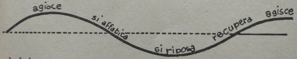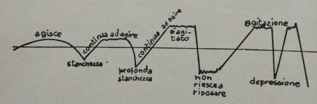L’esaurimento, fenomeno mediante il quale l’organismo semplicemente si “protegge” dagli sprechi di energia, ha effetti nefasti sulla salute sia fisica che mentale poiché comporta due reazioni precise dell’individuo: depressione ed agitazione. “Non c’è depressione senza agitazione e non c’è agitazione senza depressione. E’ questa la caratteristica dell’esaurimento; l’esaurito oscilla continuamente tra questi due poli. L’onda calma dell’instabilità naturale (Fig. 2a) si è trasformata in un’onda agitata, che tocca alternativamente gli estremi. L’uomo spossato, esaurito, diventa l’immagine esasperata dell’uomo normalmente stanco: