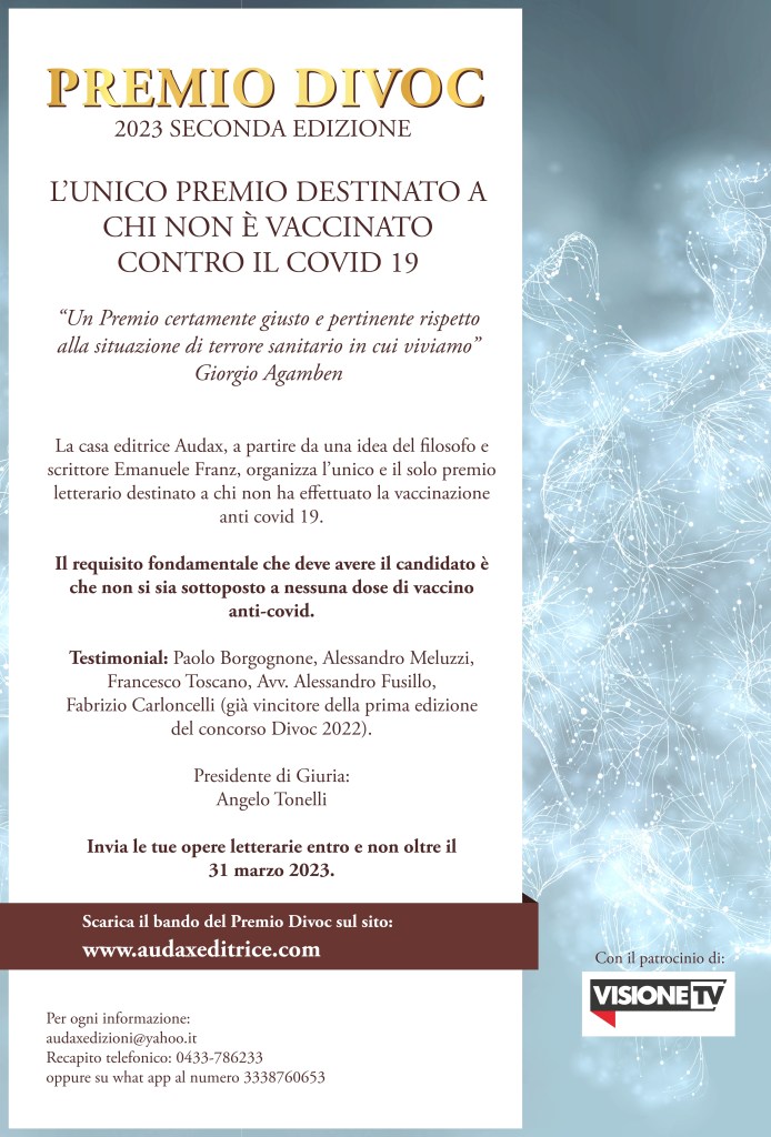 Anche quest’anno, da un’iniziativa di Audax Editrice e grazie alla perseveranza dell’editore Emanuele Franz, si terrà il Premio Divoc edizione 2023, l’unico premio letterario destinato a chi non ha effettuato la vaccinazione anti-covid. Il premio ha lo scopo di dimostrare come l’appellativo di no-vax non sia altro che un’etichetta funzionale al sistema per dividere/disgregare il sociale per controllare meglio gli individui, e rivelare invece una realtà più complessa, cioè ci ritroviamo di fronte ad un gruppo seppur da ritenersi una minoranza di persone, comunque dotato di cultura e raffinatezza e totalmente in grado di comprendere ed elaborare senza essere medici o tecnici, una visione della salute ben oltre l’approccio puramente materiale al problema. Anche quest’anno l’evento sarà caratterizzato dalla presenza di una giuria d’eccezione e di testimonial conosciuti per essere tra i più eccellenti pensatori del nostro tempo. Ovviamente non posso negare d’essere di parte, ma sto profondendo adulazioni a destra e a manca solo per essere grato alla precedente edizione, in quanto essa mi ha permesso in qualche modo di scoprire – mi si perdoni se pecco oltremodo di modestia – un certo mio talento intellettuale e narrativo cominciato in qualche modo timidamente dalle pagine di questo blog, e poi sbocciato con il mio lavoro “La Vera Natura è Duale” col quale ho partecipato credo con discreto successo l’hanno scorso.