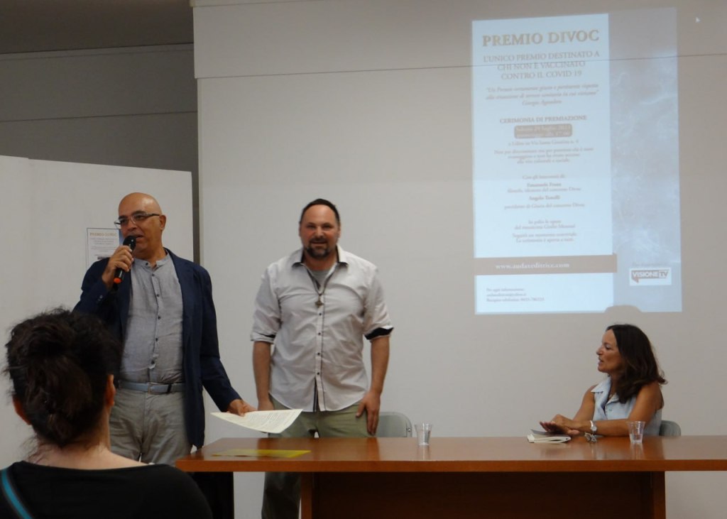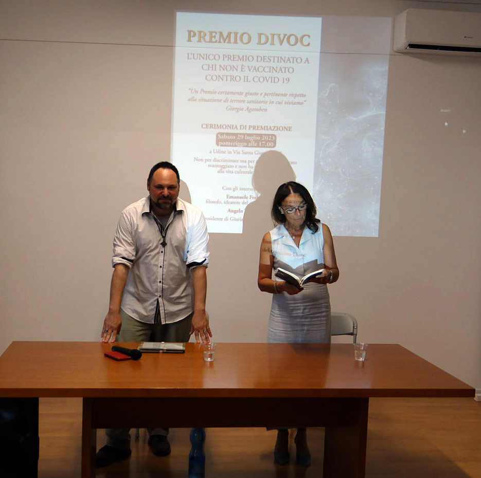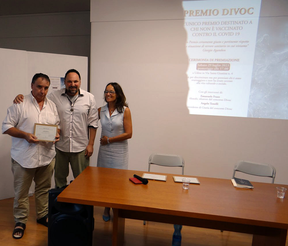 “Da reclusi a premiati. Si sono svolte ieri 29 luglio 2023 a Udine le premiazioni della seconda edizione del concorso Divoc, l’unico e il solo premio esclusivamente dedicato ai non vaccinati contro il Covid-19 ideato dal filosofo friulano Emanuele Franz e promosso dalla casa editrice Audax Editrice. Oltre cento iscritti da tutta Italia, si aggiudica il primo posto la scrittrice cremasca Rita Remagnino con l’opera “Il suicidio dell’Europa” sulla crisi europea. Il secondo classificato è Joseph Barnato con l’opera “Sciocchezze e irriverenze”. Il terzo classificato è Mariangela Ceci con l’opera “Volti della nuova era”. Moltissime le opere segnalate. Duecento persone presenti alla premiazione. Molti gli interventi da parte dei presenti con la loro testimonianza. Dove tutte le istituzioni hanno privato le libertà, il premio Divoc ha restituito dignità. L’enorme affluenza del pubblico ha mostrato che i cittadini non vogliono dimenticare la privazione delle libertà subite in questi anni di gestione sanitaria e reagire alla crisi non con la paura ma con un forte senso della appartenenza, del rito e della comunità, consapevoli che nuove misure coercitive sono sempre possibili. Sentiti i saluti dal presidente di giuria Angelo Tonelli e intervento di Ugo Rossi.